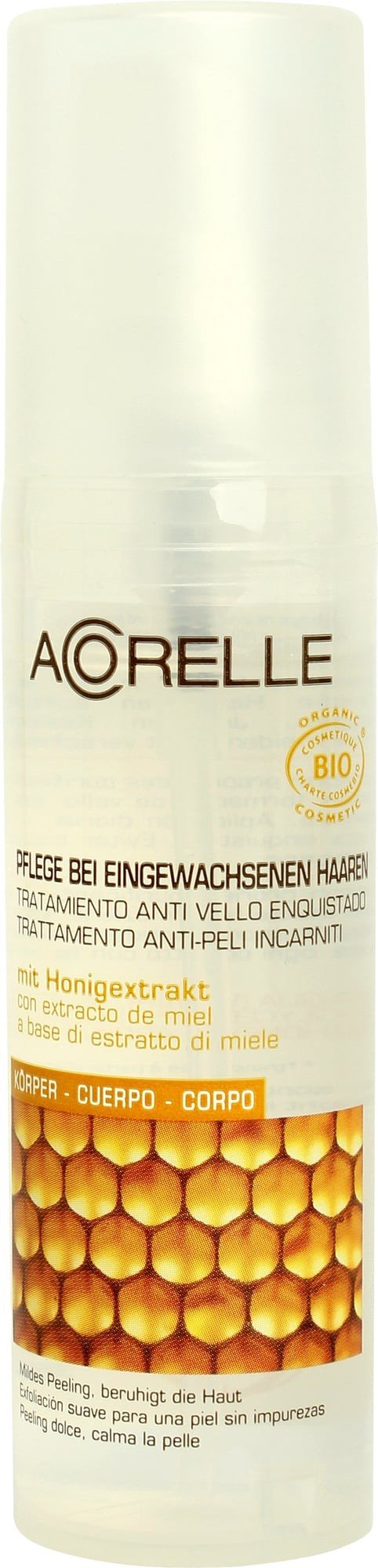 Le traitement Acorelle contre les poils incarnés contient l'hysope officinale bio de l'effet antibactérien et de l'acide AHA naturels à l'effet peeling.