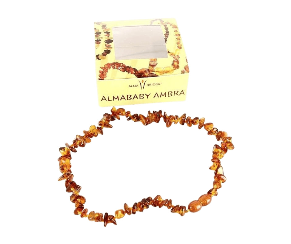 La Collanina d'Ambra Almababy Cognac per Dentizione - Alma Briosa è un accessorio pensato per offrire ai più piccoli benessere e sicurezza durante il delicato periodo della dentizione. Realizzata con autentici grani di ambra naturale tipo "nugget", è montata su un filo resistente con nodi tra ogni grano, per una protezione ottimale in caso di rottura accidentale.